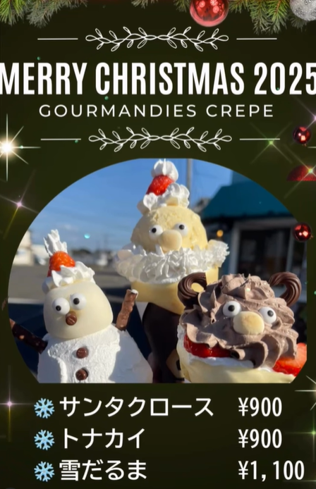期間限定商品【クリスマスクレープ】 投稿日 2025年12月22日 著者 グルマンディーズ カテゴリー お知らせ 期間限定商品【クリスマスクレープ】です。 サンタクロースとトナカイと雪だるまの3点です✨ 12月25日(木)までの期間限定ですのでお早めにお試しくださいね♪